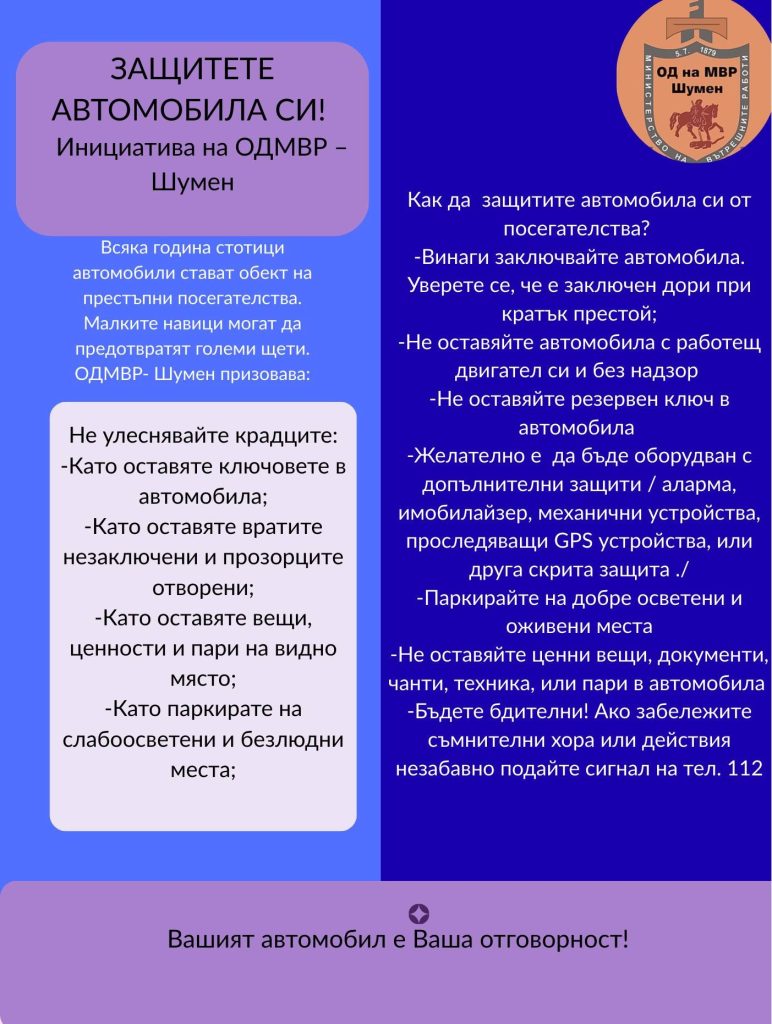 В навечерието на празничните и почивни дни, когато около търговските обекти се очаква повишено оживление, Областната дирекция на МВР – Шумен отправи важен апел към гражданите: бъдете внимателни и не давайте шанс на крадците. Според полицията именно приповдигнатото празнично настроение и забързаното ежедневие създават предпоставки за кражби от автомобили.